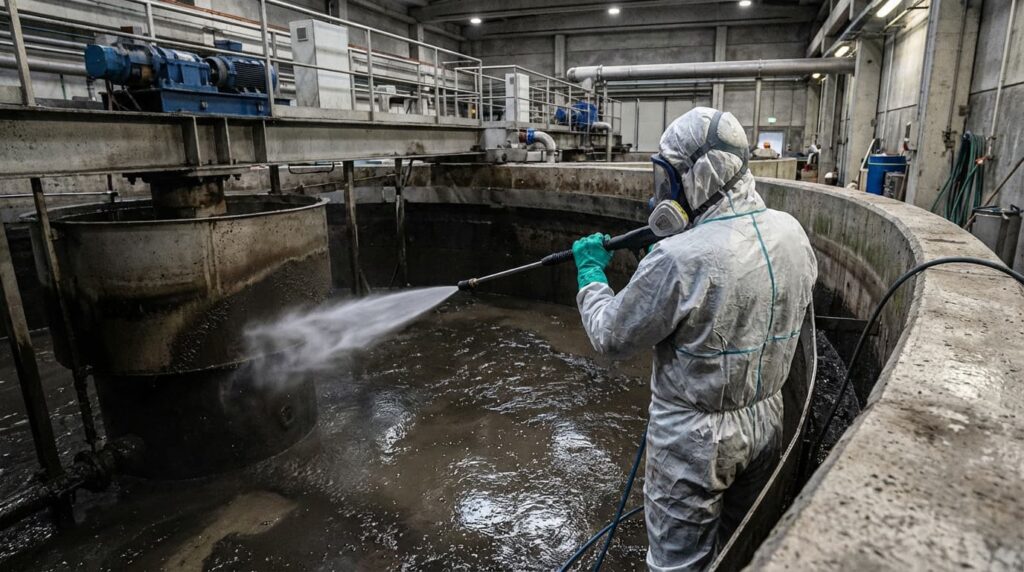 Interveniamo su tutte le sezioni critiche degli impianti trattamento acque industriali: vasche, pretrattamenti, equalizzazione, ossidazione e linee di trasferimento. Preveniamo accumuli e inefficienze e ripristiniamo rapidamente la piena funzionalità dell’impianto, operando anche in spazi confinati con attrezzature certificate.