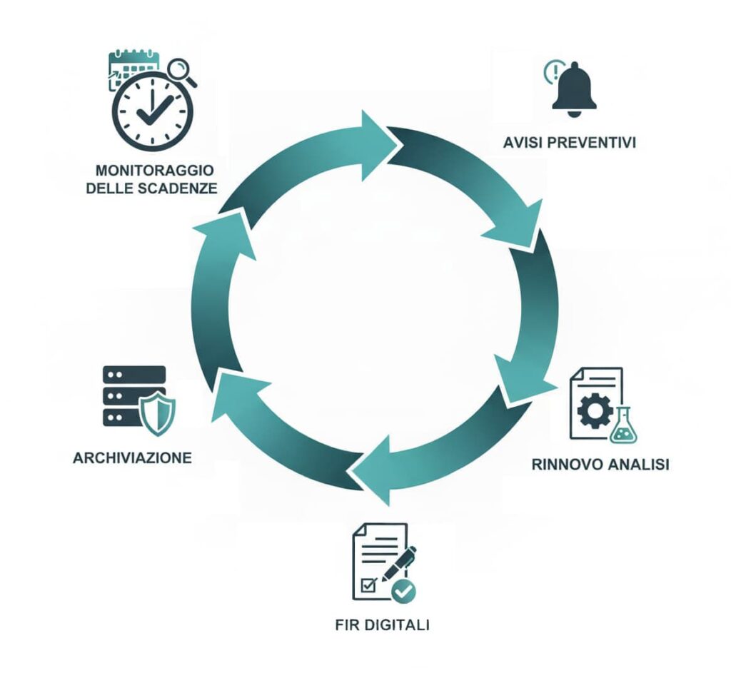 Protego Ambiente segue l’intero processo monitorando le scadenze analitiche, inviando avvisi preventivi, gestendo i rinnovi delle analisi e mantenendo FIR digitali con archiviazione completa.